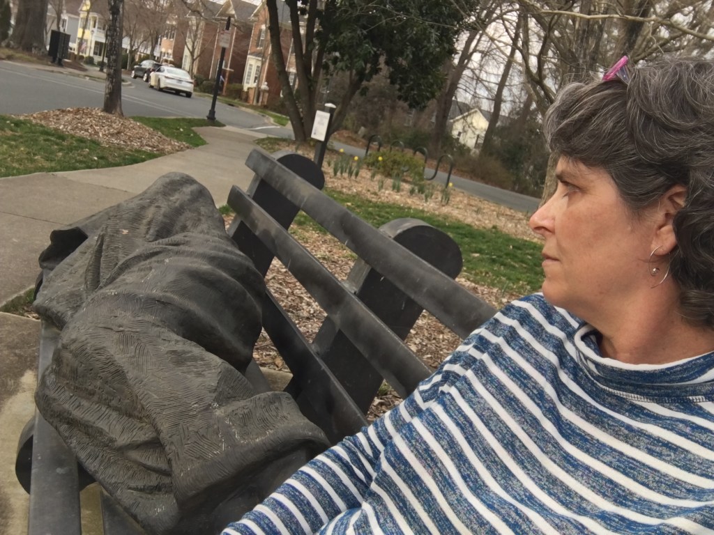 What did happen to me was, I was encouraged to go and sit by a statue at St. Alban’s Episcopal Church in Davidson.  The statue is called Homeless Jesus.  What looks like a homeless person asleep on a park bench in front of the church is actually a statue.  It was pretty powerful sitting there with the feet of Homeless Jesus pressing against my leg.  I was looking at it wondering what lessons I am to learn.  What emotions does this evoke?  What is God trying to say to me in this moment?